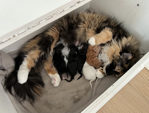 NO*Loza's Frøydis och S*Viento's Master Touch fick fem fantasktiskt fina kattungar 30 oktober. Kattungarna vägde mellan 102 g och 125 g när de föddes och de verkar gå upp bra i vikt. Frøydis är en bra mamma.